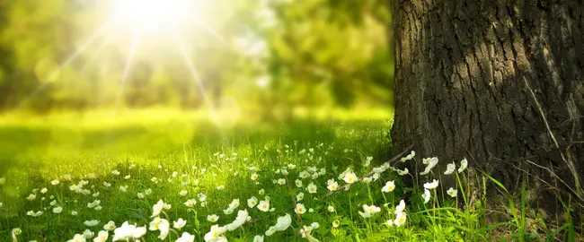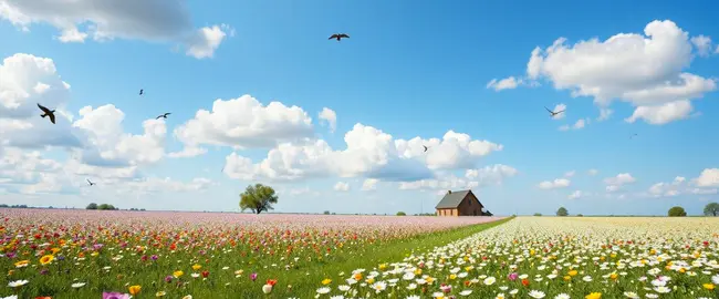 Revealing blooms and fields of green.
